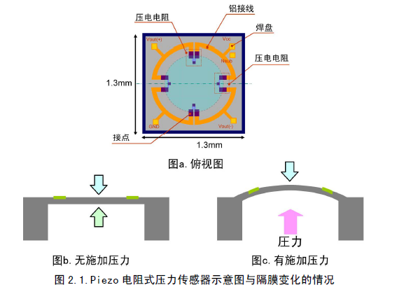 电阻式压力传感器的概观示意图。是指配轩于被称为隔膜的硅晶片上形成的4个圆板薄膜部的电阻.