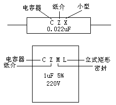 电容的种类也很多,为了区别开来,也常用几个拉丁字母来表示电容的类别,如图2所示。第一个字母C表示电容,第二个字母表示介质材料,第三个字母以后表示形状、结构等。上面的是小型纸介电容,下面的是立式矩开密封纸介电容。表5列出电容的类别和符号。表6是常用电容的几项特性。