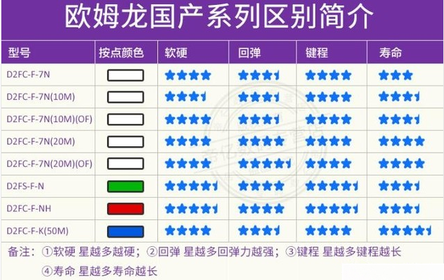 欧姆龙虽说是一家日本厂商,但是它的微动开关却有好多产地,例如我们平时看到的通常是国产的D2FC-F-7N(10M)微动,这也是鼠标当中应用颇广的一款微动开关,性价比非常高。其中D2FC-F-7N是它的型号,(10M)是指它的理论点击寿命有1000万次。