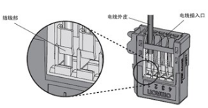 2、将电线插入到电线插入口的深处。电线的外皮必须进入到电线插入口内部,并确认导线尖端通过了接线部。 |
