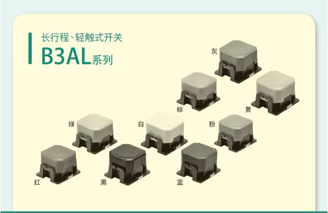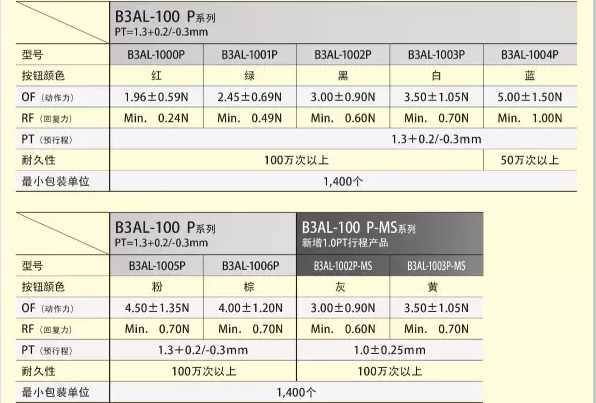 潺林电子为大家介绍欧姆龙新型长行程、轻触式开关:B3AL系列:按键分为红色B3AL-1000、绿色B3AL-1001、黑色B3AL-1002、白色B3AL-1003,等多种类型。压花带卷盘装型。