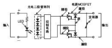 MOS FET继电器是在输出元件中使用功率MOS FET的SSR。为使功率MOS FET动作, 光电二极管阵列作为受光元件使用。输入端子中有电流流过时, LED会发光。这个光使光电二极管阵列中发生光电流, 这使栅极电压使功率MOS FET置于ON。用源共通连接2个功率MOS FET, 可控制AC负载。DC专用的类型中有带1个电源 MOS FET的类型。