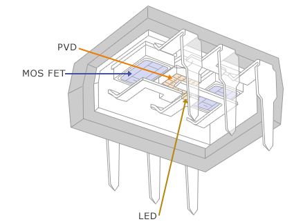当正向电流流过时,输入发光二极管(LED)发出红外光。当此光照射在光电二极管(PVD)上时,PVD中会产生电压。