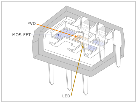 此外,如下图所示,在我们的光耦合MOSFET中,输入LED和输出侧的PVD用具有高透明度的高度绝缘树脂彼此绝缘,并且外部还被黑色覆盖。深色的深色树脂。