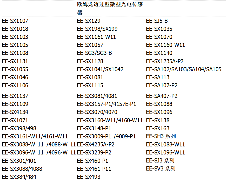 对应我们欧姆龙透过型微型光电传感器又有哪些型号呢?我们通过下图来了解一下: