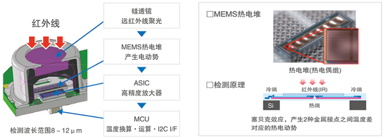 采用欧姆龙自行设计的MEMS技术,将热电堆元件和ASIC封装在一起,实现了超小型化。
