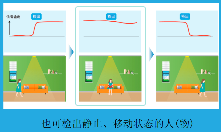 经常检测视野内的红外热能并输出信号,相比竞品,静止状态的人(物)也能检测出来。