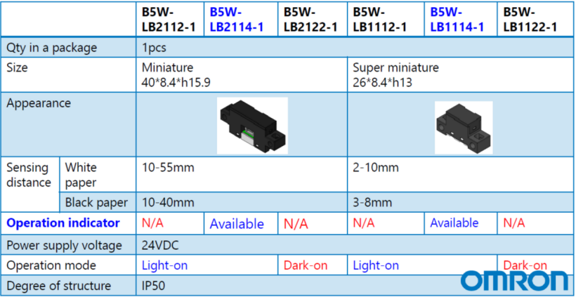 欧姆龙的B5W系列传感器最近迎来了新成员:B5W-LB2114-1和B5W-LB1114-1。在原有的LB系列进行了升级,为客户方便使用,增加了LED指示灯。
