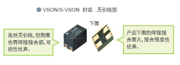 l VSON/S-VSON封装,虽然无直接引线,但是继电器侧身焊接结合处面积大,结合强度优异。