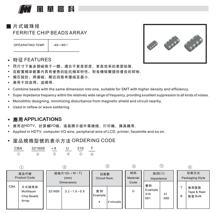特征: 同尺寸下集多个磁珠于一体,适合于更高密度、更高效率的表面贴装。 在较宽频率范围内具有优秀的阻抗频率特性,对各种噪声提供优良的抑制。 独石设计,将漏磁、邻近回路串扰减至最小。 应用于回流焊、波峰焊。 应用: 应用在HDTV、计算机I/O线、液晶显示器外围总线、打印机、传真机等。